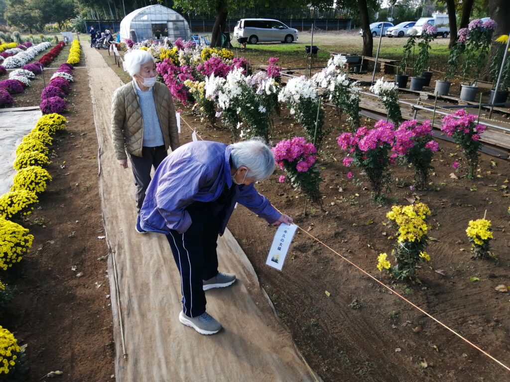 11月14日のお出かけデイは、うしく菊花公園で開かれている「うしく菊まつり」を見に行きました。赤・白・黄色をはじめさまざまな色の菊花が整然と植えられている園内を散策しました。「うしく○○」と名ずけられた菊が多く見られました。公園を管理されている事務局長さんの説明では、交配させて新しい菊を作り、3年経過して安定して開花するのを確認してから、名前を公募して付けるそうです。