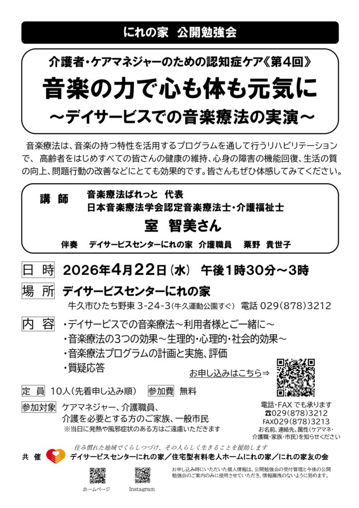 にれの家では第4回公開勉強会「音楽の力で心も体も元気に」を開催します。