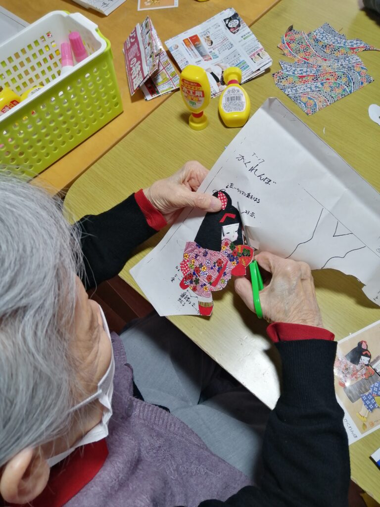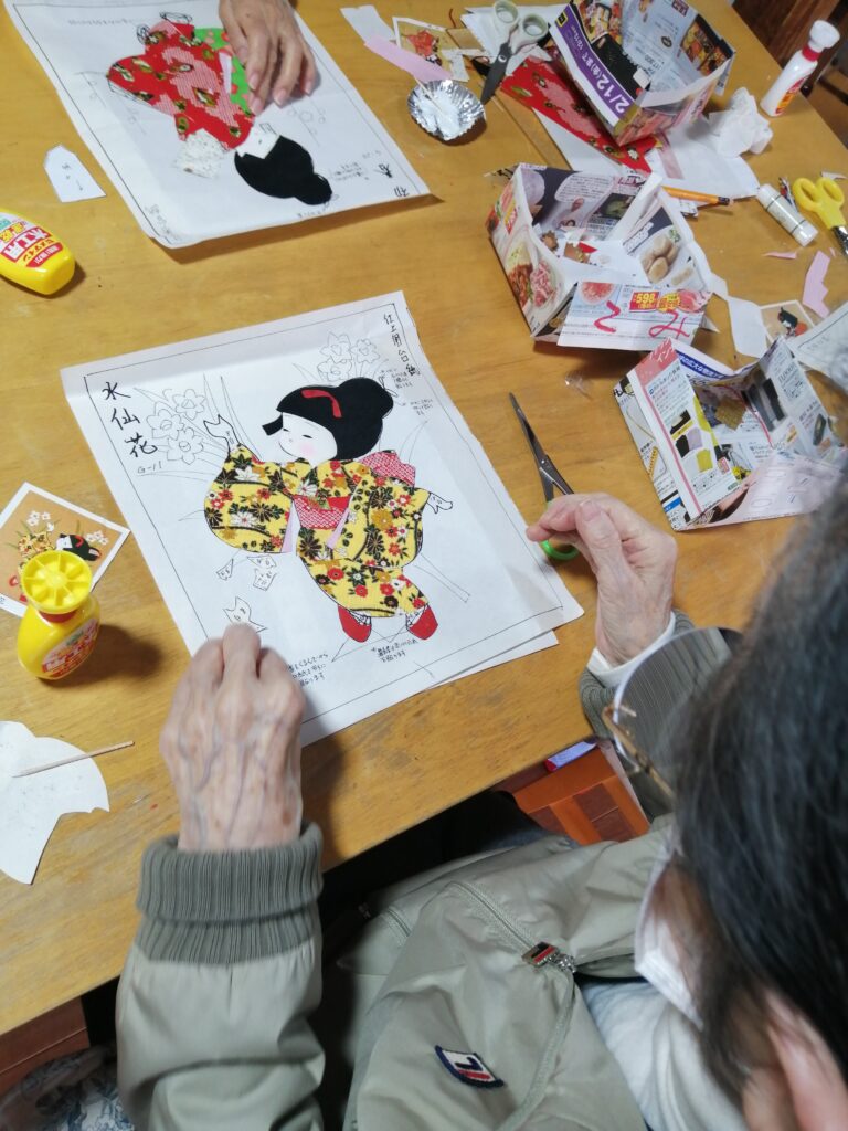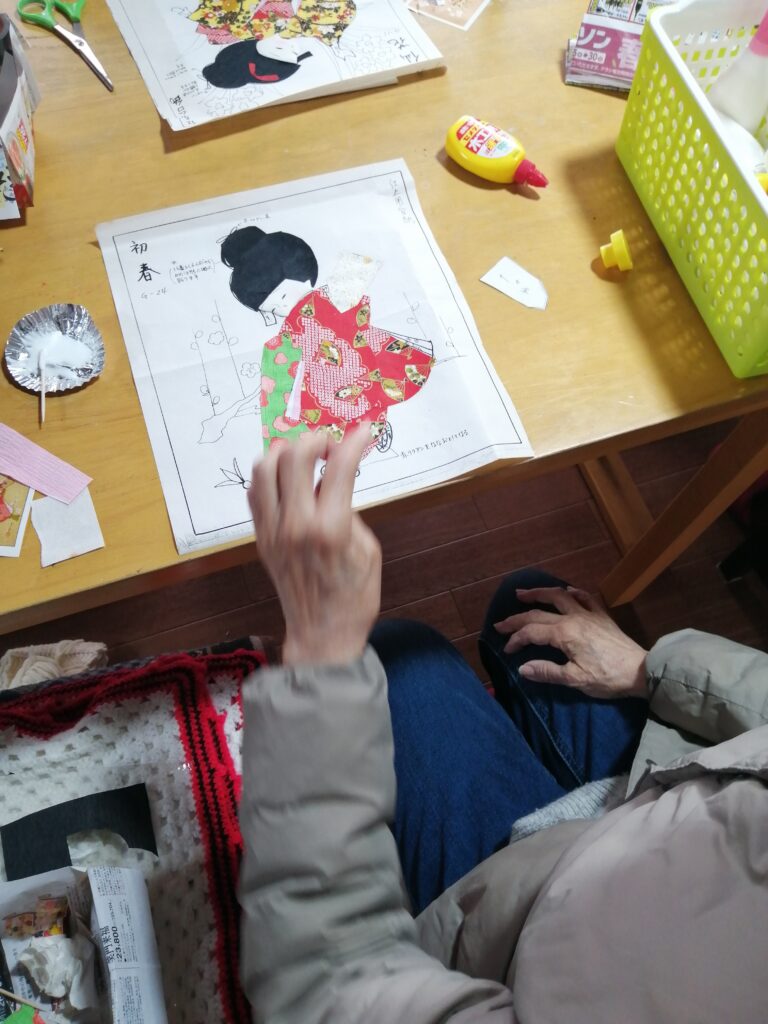 水曜日のハンドメイド班では貼り絵にチャレンジしています。細かい作業ですが、皆さん真剣に取り組んでいます。